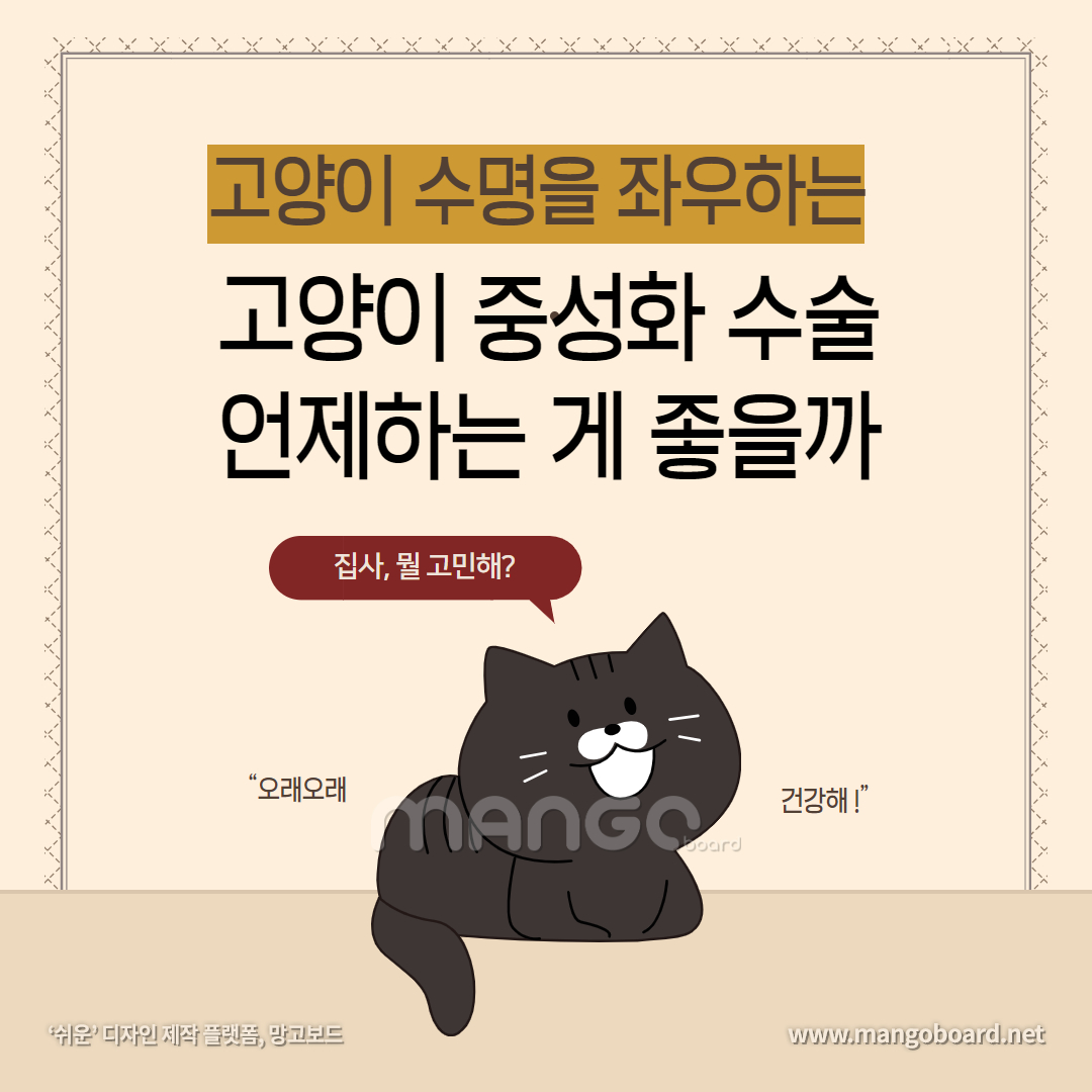 고양이는 중성화 수술을 권합니다. 실제 수술을 하면 발정 스트레스가 없어지기도 하고, 수명도 길어진다고 하거든요. 특히 암컷 고양이는 성묘가 되기 전 중성화 수술을 하면 유선 종양 발병률을 90% 이상 낮춰준다고 합니다. 1살 이전 수술 시 86% 정도라고 하고요. 이 뿐 아니라 중성화 수술을 하지 않으면 암컷은 유선염, 자궁내막염 등에, 수컷은 전립선염, 고환암 등의 위험이 높아진다고 하니, 고양이 중성화 수술은 꼭 해주시기 바랍니다.