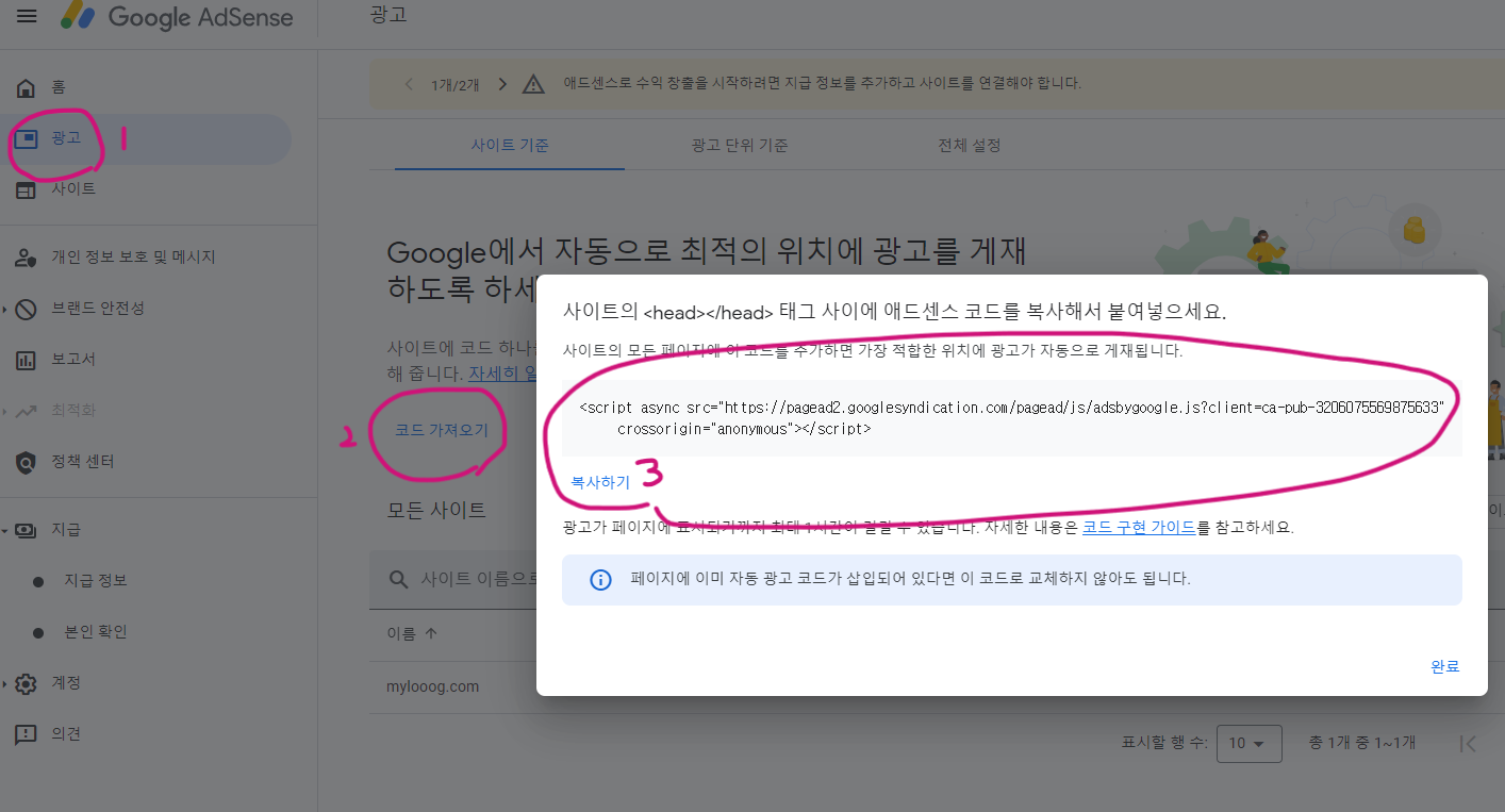 1 - 구글애드센스 사이트로 들어가서 좌측 <광고> 클릭 - 본문 중앙에 '코드 가져오기' 클릭 - '복사하기' 로 코드 복사.