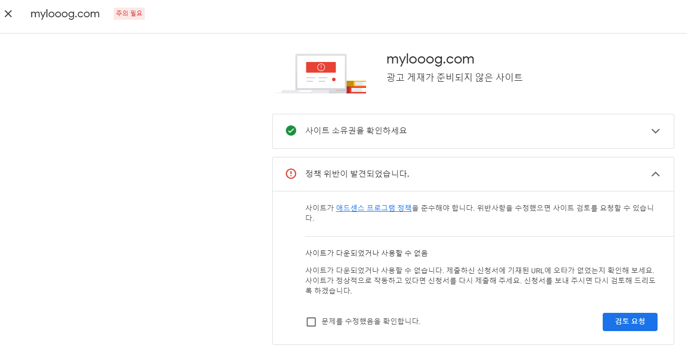 승인신청을 한 줄도 몰랐고, 승인신청을 하게 되더라도 한번에 승인이 되지 않겠지, 하는 생각(이 부정적인 생각이라니!!)은 했었지만 막상 '주의필요' 라는 단어가 보이니 막막합니다.